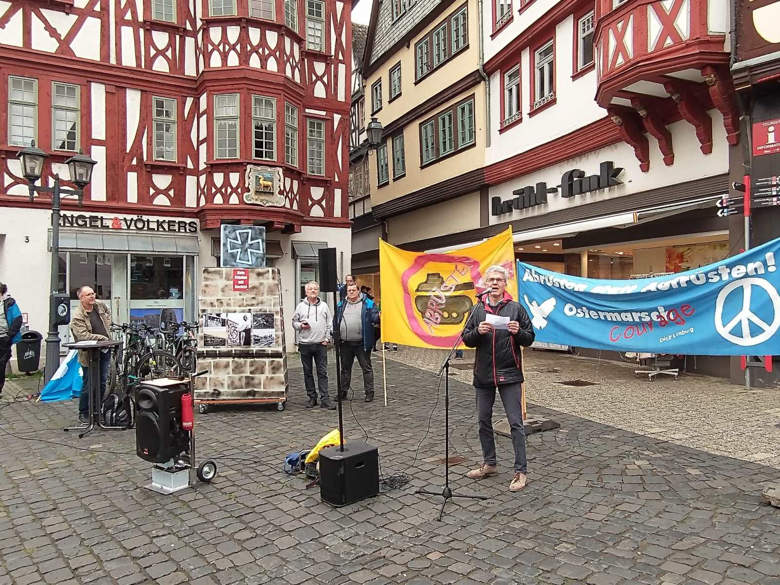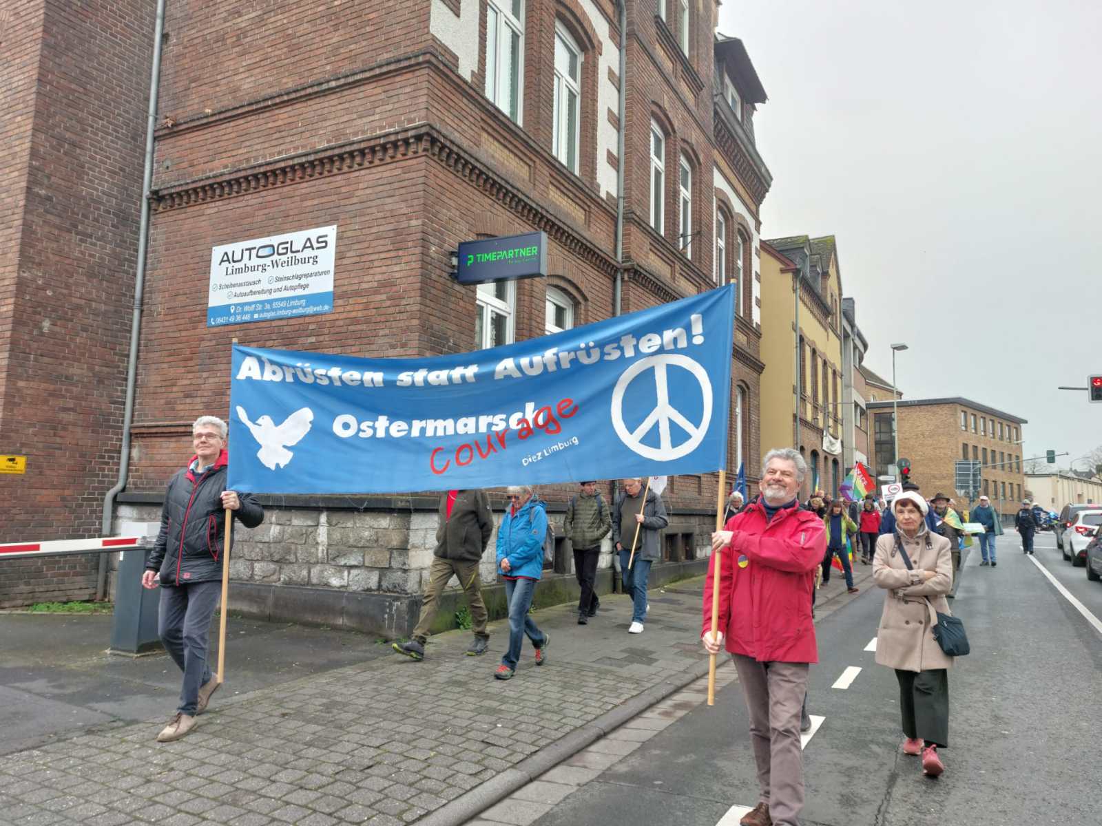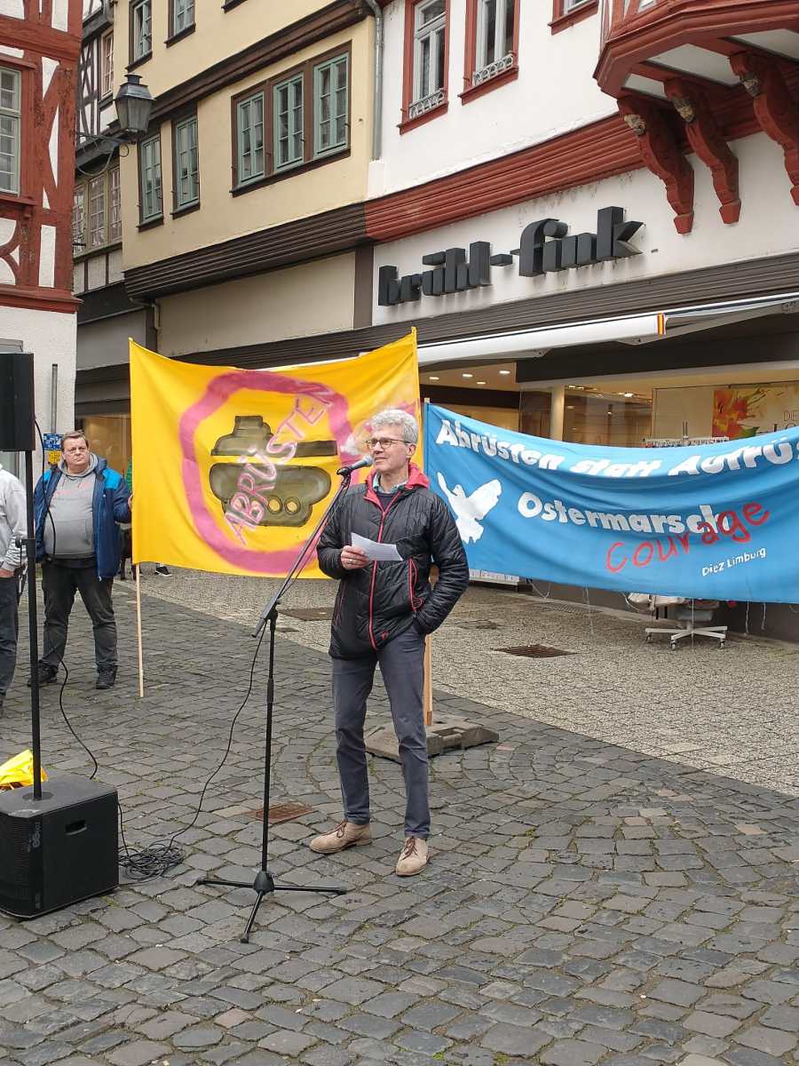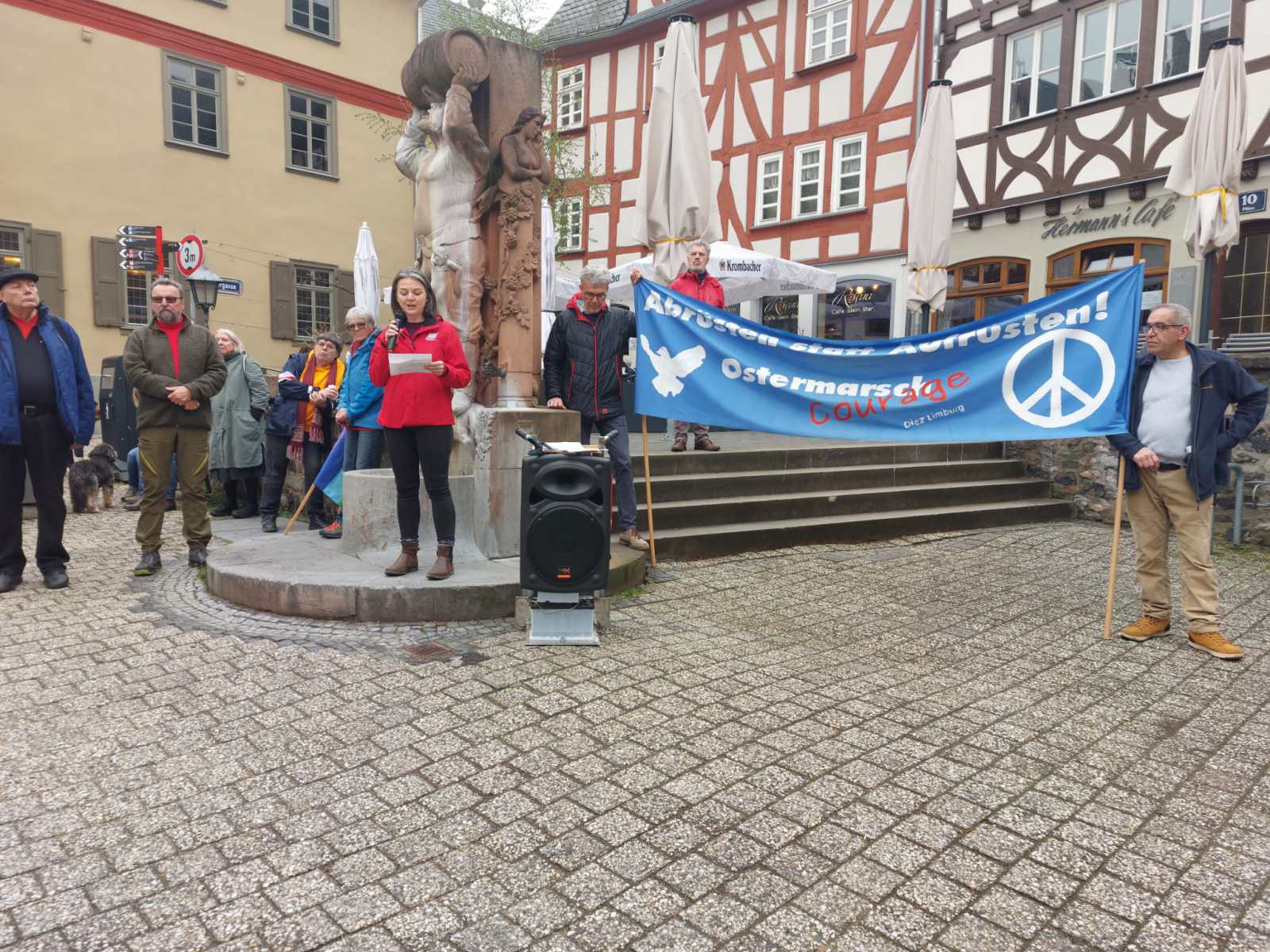 Immer noch nicht genug Leute, die mitmachen, aber gut hör- und sichtbar: Der Limburger Ostermarsch in diesem Jahr mit an die 150 Leuten, die sich von regierungsamtlichen Warnungen (Baerbck, Lindner, Scholz, Habeck) nicht abhalten ließen, für Frieden statt Aufrüstung, Verhandeln statt Schießen, Einfrieren statt Sterben auf die Straße zu gehen, und – das war neu – danach auch noch in lockerer Runde weiter zu diskutieren.