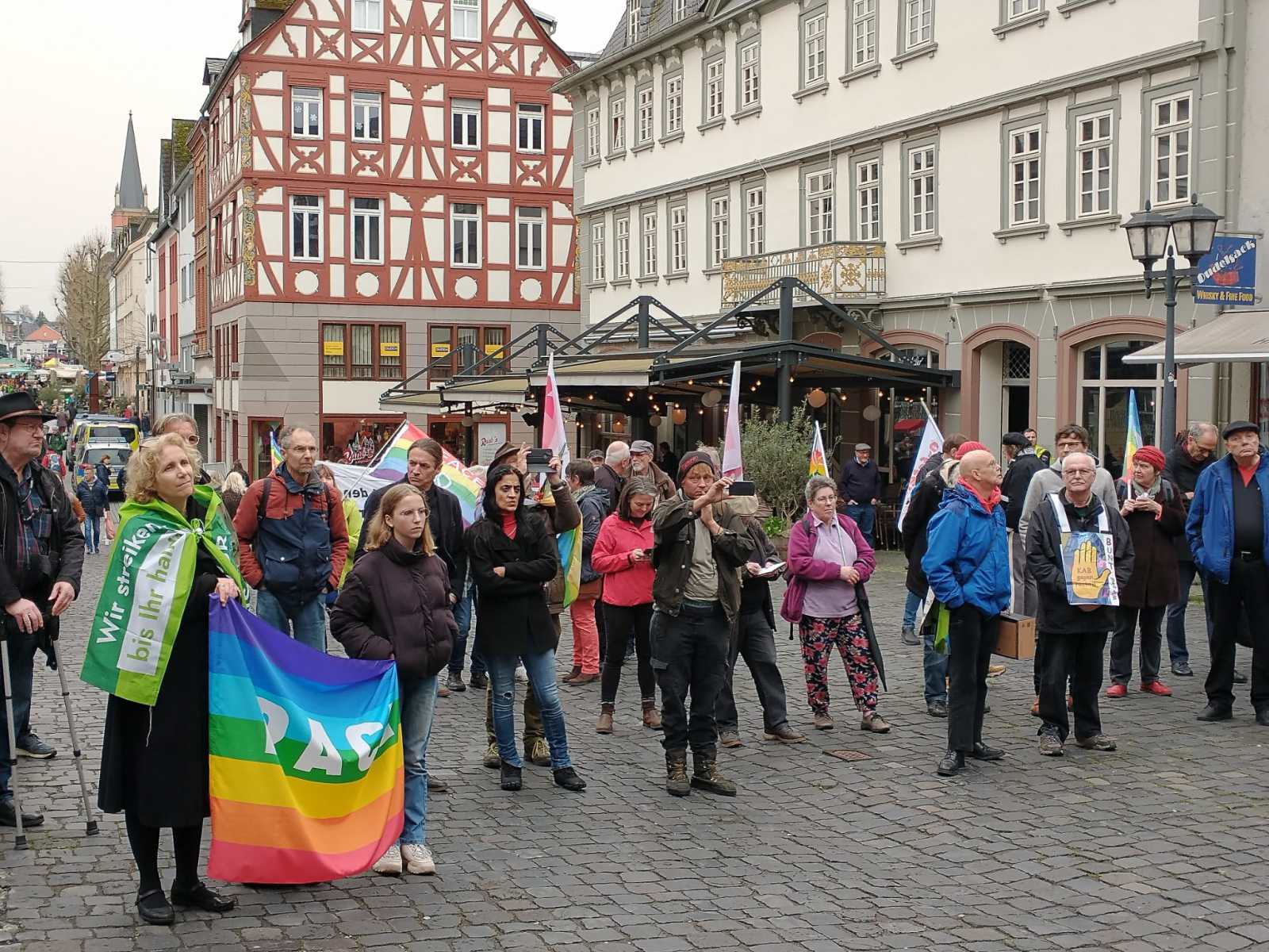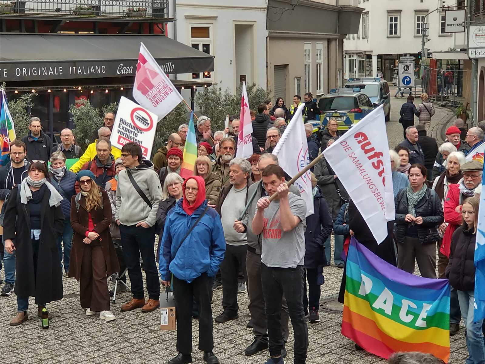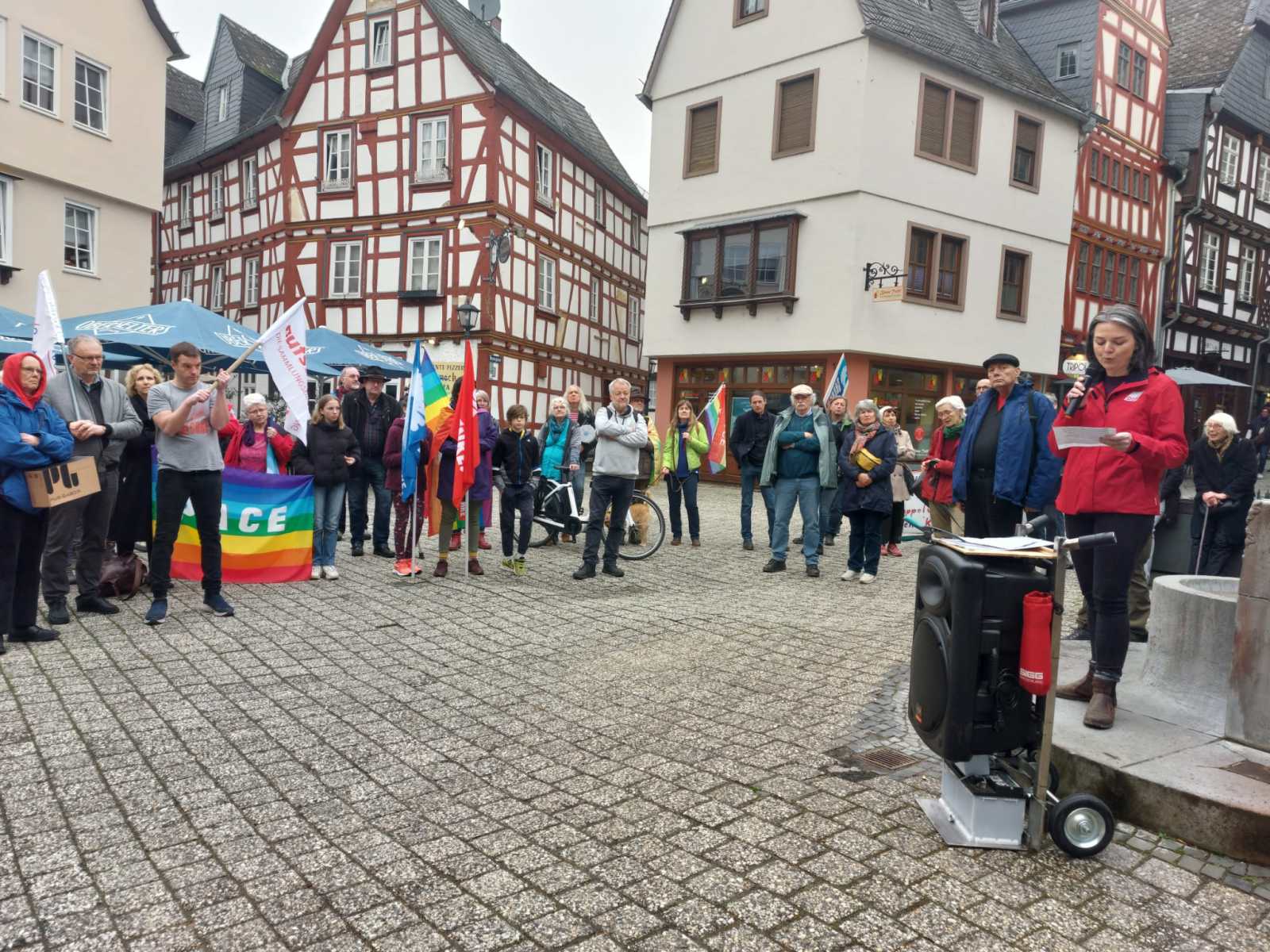 Immer noch nicht genug Leute, die mitmachen, aber gut hör- und sichtbar: Der Limburger Ostermarsch in diesem Jahr mit an die 150 Leuten, die sich von regierungsamtlichen Warnungen (Baerbck, Lindner, Scholz, Habeck) nicht abhalten ließen, für Frieden statt Aufrüstung, Verhandeln statt Schießen, Einfrieren statt Sterben auf die Straße zu gehen, und – das war neu – danach auch noch in lockerer Runde weiter zu diskutieren.